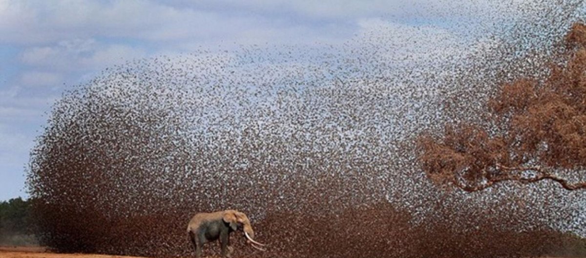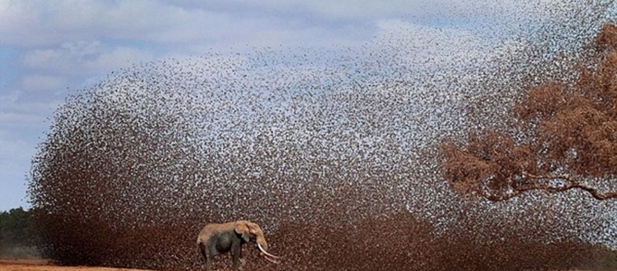 Hayır, filin etrafında gördükleriniz bir toz fırtınası veya çamur sıçraması değil! Devasa boyuttaki bir Kırmızı Gagalı Kuela (Quelea quelea) sürüsü. Bu tür, Dünya üzerindeki en geniş popülasyona sahip kuş türüdür. Herhangi bir zaman diliminde, 1.5 milyar bireyi üremeye hazır, yetişkinler halindedir ve toplamda, Dünya'daki bireylerin sayısının 10 milyarı geçtiği düşünülmektedir.