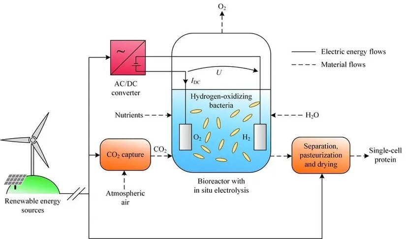 Ham maddeler bir biyoreaktör içerisinde elektrolize maruz bırakıldığında, yüzde 50'den fazla protein ve yüzde 25 karbonhidrat içeren bir toz oluşturuyor. Oluşan ürün, kullanılan mikrobun türüne göre değişebilir.