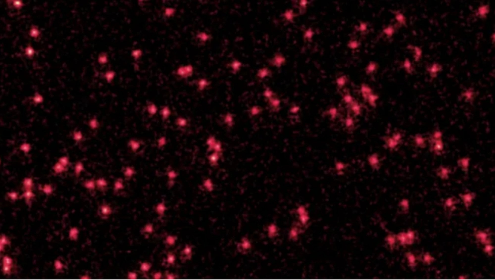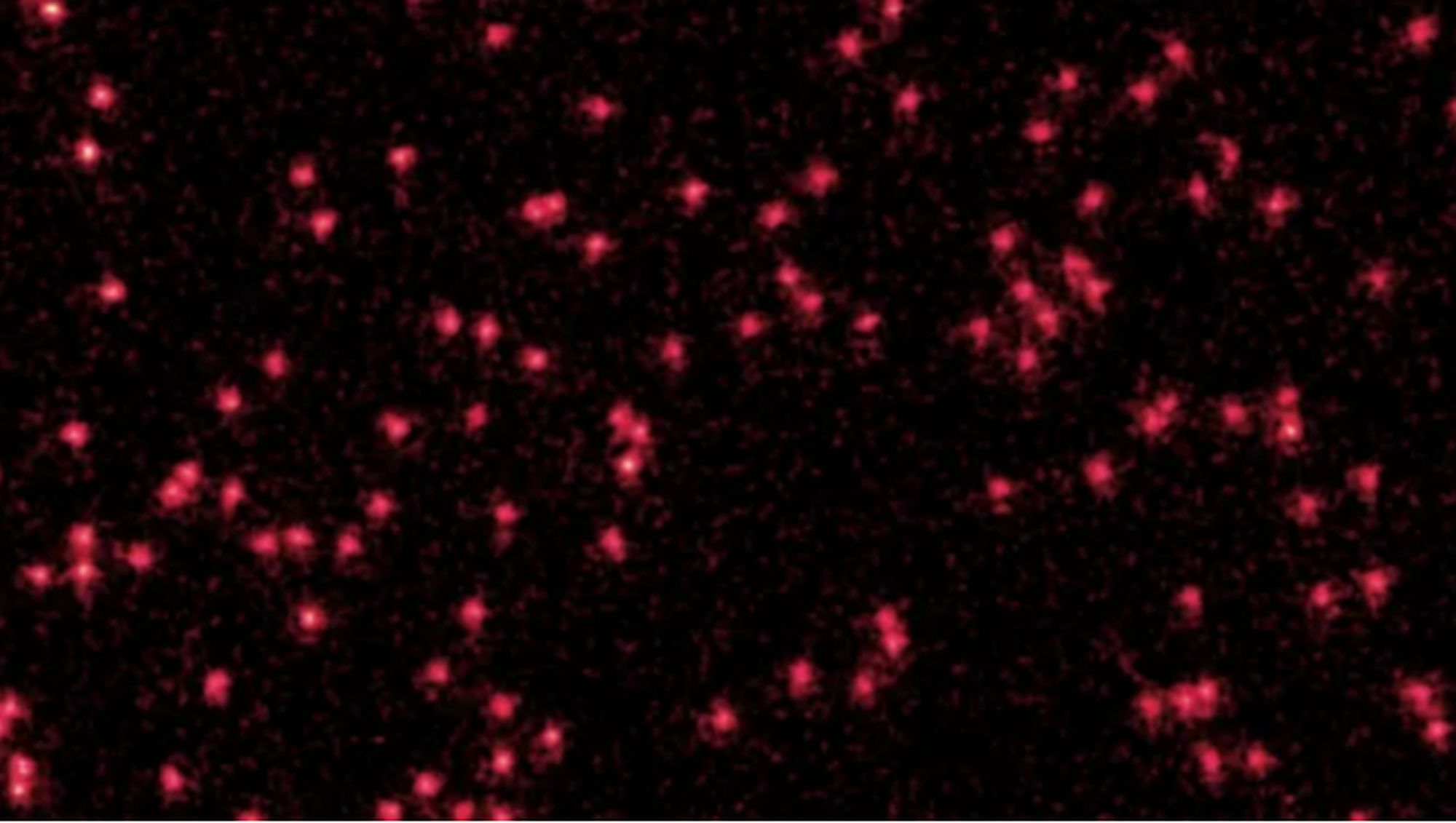 Görüntü, floresan atomların keskin kırmızı noktalarının dalga paketlerinin bulanık lekelerine dönüştüğünü gösteriyor. Bu, kuantum mekaniğinin temel taşlarından biri olan atomların hem parçacık hem de dalga olarak var olduğu fikrinin çarpıcı bir göstergesidir.