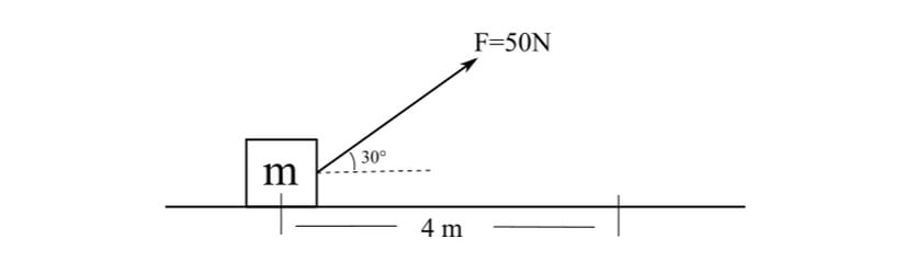 Gelin bir de örnek çözelim: Yerden duran mm kütleli bir cismi 50 N50 \text{ N}'luk bir kuvvetle, zeminle 30°30° açı yapacak şekilde çekerek 44 metre sağa sürükleyelim. Bu sırada cisim yerden yükselmesin. Kuvvetin yaptığı iş nedir?