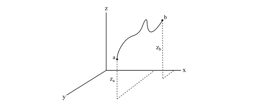 Wab=∫abF⃗dr⃗=∫abFzdz=−mg(zb−za)=−mgh\Large W_{ab} = \int_a^b \vec{F}d \vec{r} = \int_a^b F_z dz = -mg (z_b - z_a) = -mgh