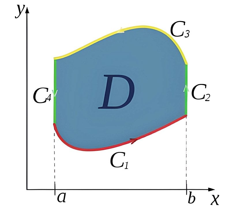 Düzlemde 𝑃(𝑥,𝑦)𝑃(𝑥, 𝑦) ve 𝑄(𝑥,𝑦)𝑄(𝑥, 𝑦) gibi kısmi türevleri sürekli iki fonksiyon ele alalım. Bu düzlemde bir DD yüzeyi ve bunu çevreleyen bir CC kapalı eğrisi olsun. Bu durumda Green Teoremi, kısmi türevlerin yüzey içindeki integralini, CC üzerinden çizgisel integrale