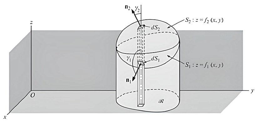 Eğer SS yüzeyi kapalı ise, 𝑛^𝑛̂ birim vektörü SS yüzeyine dik ve dışarı doğrudur. S S yüzeyi açık ise yani çift yüzlü bir yüzey ise, yüzeyin normal vektörü sağ dört parmağı integralin yönünü göstermek üzere baş parmak yönündedir. Herhangi bir SS yüzeyinin dS⃗d\vec{S} diferansiyel yüzey elemanı büyüklüğü d𝑆d𝑆’ye eşit, yönü de 𝑛^ 𝑛̂ normal birim vektörü yönünde olan bir vektördür. Böylece dS⃗=𝑛^d𝑆d\vec{S} = 𝑛̂ d𝑆 olmak üzere S yüzeyi üzerinden alınan yüzey integralleri aşağıdaki gibi tanımlanır.