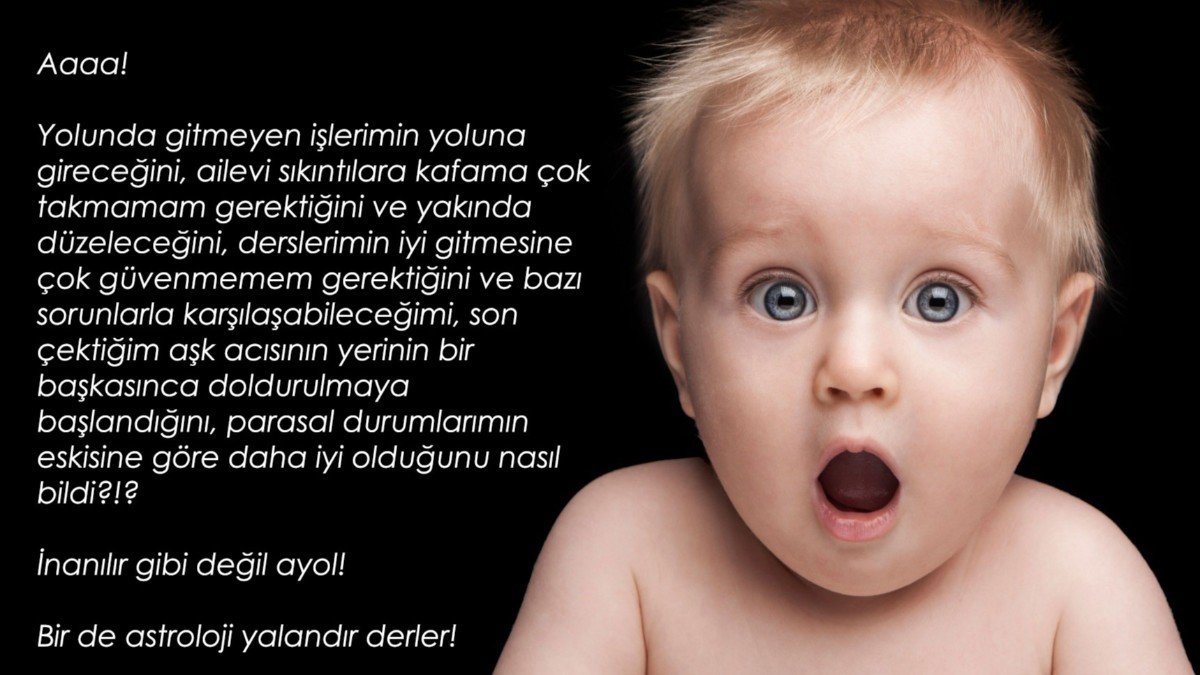 En tepedeki görselde rastgele yazdığımız tahminlerin bir kısmı, büyük oranda okurlarımıza uyacaktır. Bu, bizim derin astroloji bilgilerine sahip olduğumuz anlamına gelmez; psikolojide Forer-Barnum Etkisi dediğimiz gibi olguya başvurduğumuz anlamına gelir.