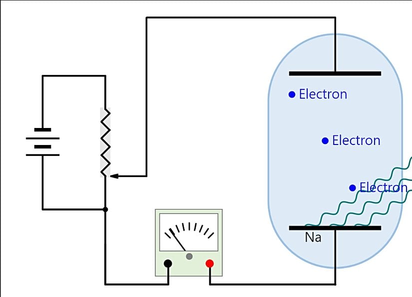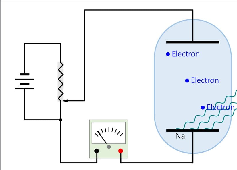 JavaLabBu düzenekteki iki elektrot arasında negatif potansiyel oluşturursak sodyumdan kopan elektronların karşıdaki plakaya ulaşan elektron sayısı azalacaktır. Öyle bir potansiyel değeri vardır ki karşıya ulaşan elektron sayısı sıfıra iner; yani fotoelektronlarla üretilen elektrik akımı durur. Bu potansiyele durdurma potansiyeli veya kesme potansiyeli denir. Bu potansiyeli bulmak için basit bir denklem kullanabiliriz:
