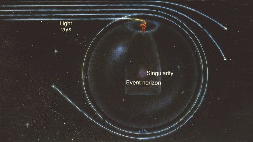Benzer şekilde, bir kara deliğin etrafında ışık, bırakın sadece yön değiştirmeyi, tam dairesel bir rotaya girerek kara delik etrafında dönüp durabilir:
