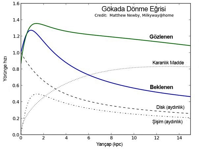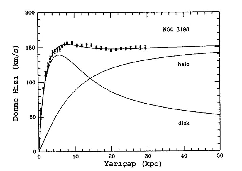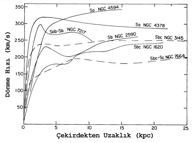 - Galaksilerin dönme eğrileri, merkezden dışa doğru hız dağılımını gösterir ve spiral galaksilerde hızın dış kısımlarda sabit kalması, görünmeyen kütlenin varlığını işaret eder.