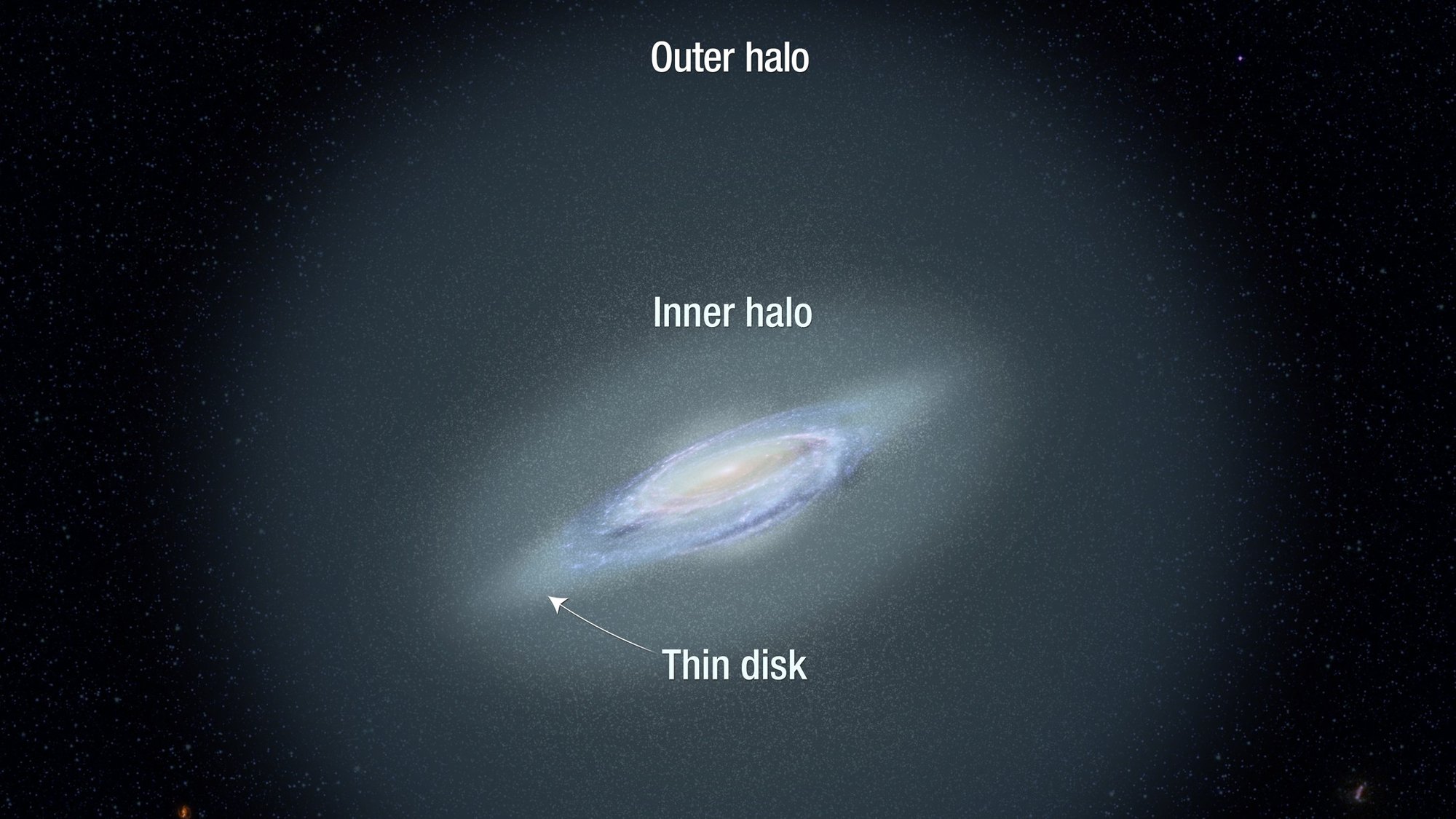 Hale, dış sınırları çok uzakta olduğu için incelenmesi en zor kısımdır. Burada yıldızlar, yüksek yoğunluklu galaksi diskine ve şişkinliğine kıyasla çok seyrek. Ancak hale, karanlık madde tarafından yönetiliyor ve aslında galaksinin kütlesinin çoğunu içeriyor.