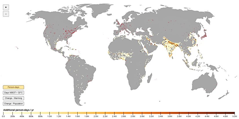 Bilim insanları daha sonra sıcaklığın insan sağlığını tehdit edecek seviyeye vardığı gün sayısını 13.000'den fazla şehrin her birinde yaşayan insanların sayısıyla çarparak bu sonucun her yıl nasıl değiştiğini takip etti. Aşırı ısıya maruz kalma oranını ölçmek için, sıcaklığın 30°C "Islak Termometre Sıcaklığı"na ulaştığı günleri saydılar. 30°C ortalama bir yaz gününün sıcaklığı gibi görünebilir, ancak Islak Termometre ölçümü, yüksek nemin sıcaklığı daha fazla hissettirdiğini gösterir. Bunun nedeni hava nemliyken terin daha yavaş buharlaşması ve insanların buharlaşmanın yarattığı serinlik hissini yaşayamamasıdır. Islak termometrede 30°C, hissedilen sıcaklıkta 41°C' ye eş değerdir.