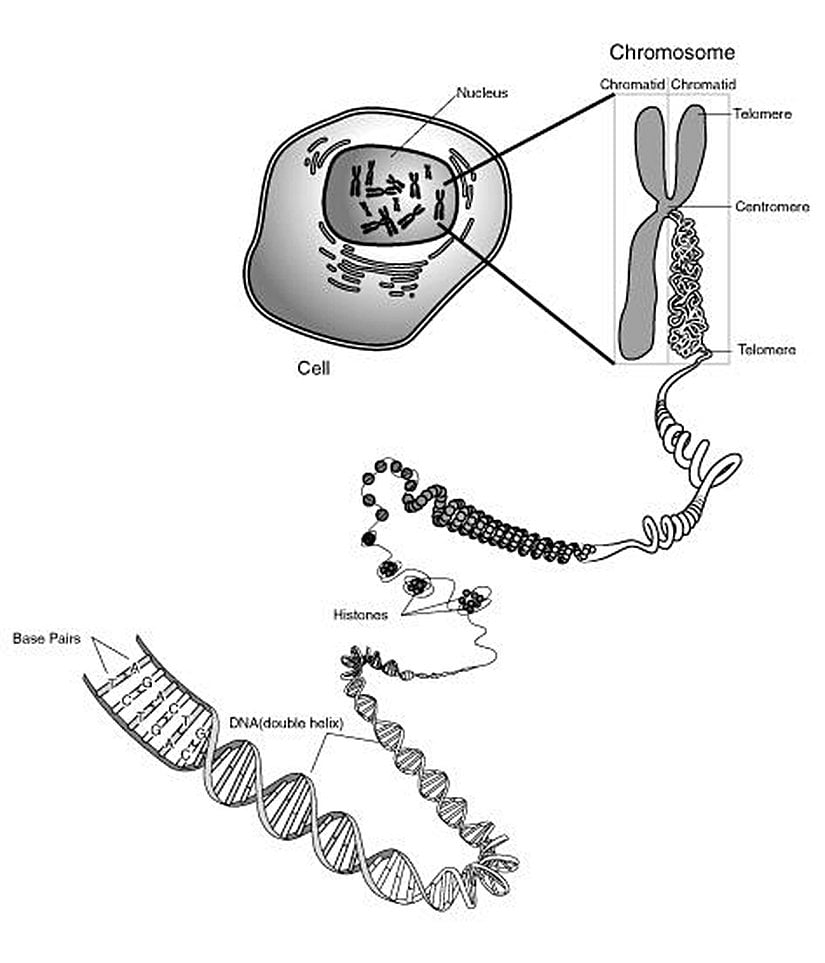 Bu görsel de son derece açıklayıcıdır. Görebileceğiniz üzere hücre çekirdeğinin içerisinde özelleşmiş olarak bulunan bu DNA yapıları, kromozomlardır. Kromozomlardan yola çıkarak bazlara kadar yapılan açılımı, yukarıdaki görseli takip ederek bulabilirsiniz.