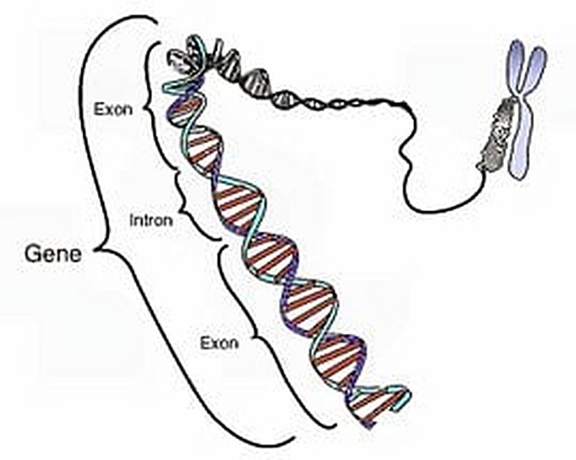 Genler, nükleotit dizilimlerinin (bilgisayar veya dil benzetimi dahilinde "harflerin") anlam kazandığı bölgelerdir. Burada anlam kazanmaktan kasıt, yine bilim-dışı ya da doğaüstü bir "anlam" değildir. Canlıların, "canlılık özelliklerini" sürdürebilmeleri için üretmek zorunda oldukları çeşitli kimyasallar vardır ve genler, bu kimyasalların salgılanma sırasını, biçimini, vb. özelliklerini etkiler ve bu bilgileri depolar. İşte protein sentezi yapan bu anlamlı nükleotit gruplarına gen demekteyiz. Genlerin de her bölgesi protein sentezine katılmak zorunda değildir. Gen dizilimlerinin içerisinde ekson olarak bilinen kısımlar protein yapısına katılırken, intron denen kısımlar kesilerek atılırlar. Bu ikinci kısımların her zaman işlevleri olmak zorunda değildir. Kimi zaman tamamen işlevsiz ("hurda DNA") olarak bulunurken, kimi zaman eksonların protein sentezine katılmalarını düzenleyen bir görev alırlar. Aşağıda bu yapılar görülmektedir: