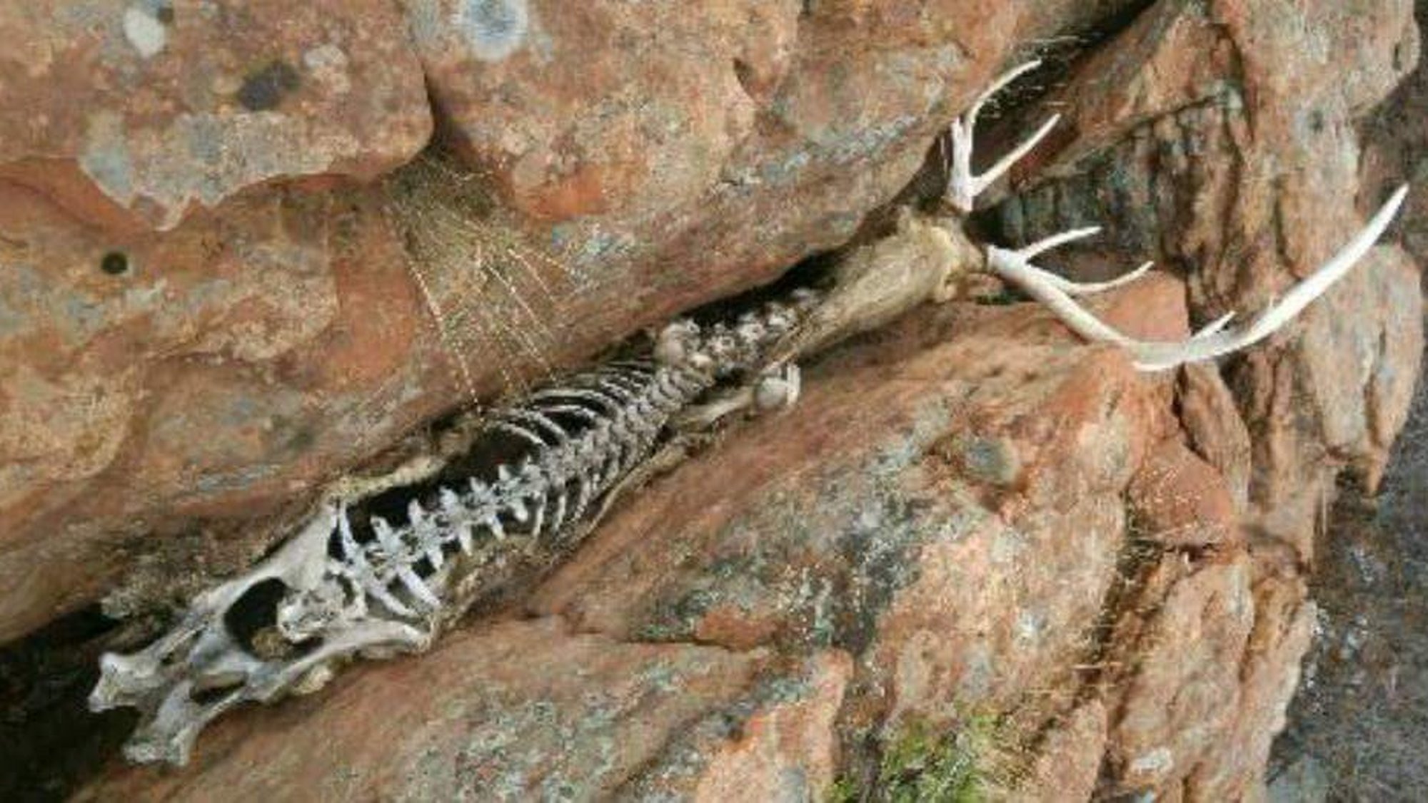 Aşağıdaki fotoğrafta iki kaya arasına sıkışarak can vermiş bir elkten (iri bir geyik türü) arta kalanları görüyoruz. Aynı zamanda bu fotoğraf, evrimin iki önemli mekanizması olan Genetik Sürüklenme ile Doğal Seçilim arasındaki ilişkiyi de harika bir şekilde gösteriyor.