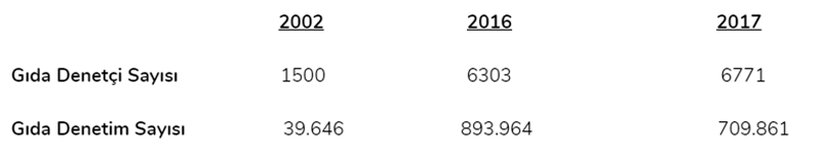 Türkiye’de gıda güvenliği ve izlenebilirliği ile ilgili tek yetkili otoritenin Gıda, Tarım ve Hayvancılık Bakanlığı olduğunu yukarıda belirtmiştik. Bakanlığın çıkardığı yönetmelik ve kanunların takibi ve denetimindeki resmi denetçi kadroları yetersizdir. Var olan bu denetçi kadroları sektörlere göre uzman değildir. İşletmelerde ‘’İyi Üretim Uygulamaları (GMP)’’ ve gıda güvenliği yönetim sistemlerinin (HACCP) kontrolünde ciddi denetim problemleri yaşanmaktadır. Aşağıdaki rakamlarla verilen 2002, 2016 ve 2017 yıllarında Türkiye’deki gıda denetçi ve gıda denetim sayıları konuyla ilgili açıklayıcı olacaktır.