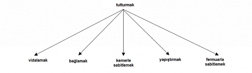 Bunu yapmanın özellikle iyi bir yolu, başka bir fiil tarafından tanımlanan genel bir eylemi gerçekleştirmenin belirli bir yolunu tanımlayan fiiller anlamına gelen troponimlerin bir listesini oluşturmaktır. Aşağıdaki görselde tutturmak fiilinin farklı bağlamlarda kullanımını göreceksiniz: