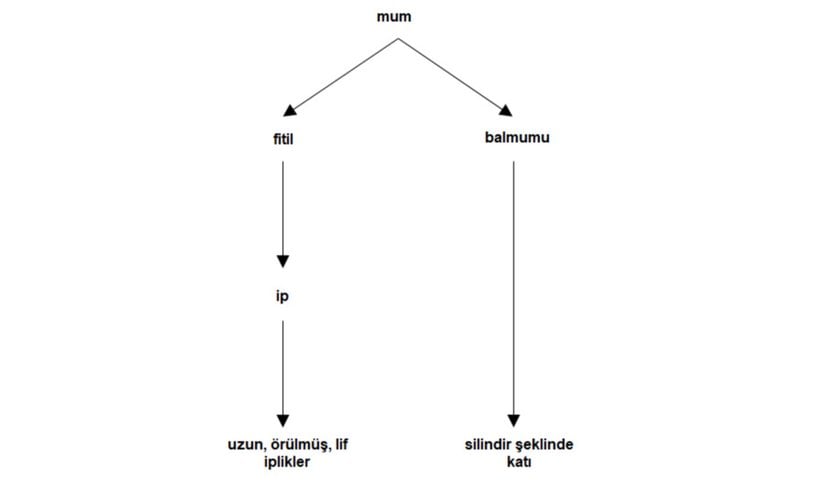 Bu genel-parça diyagramında bir mumun fitil ve balmumu olarak iki ana bileşenden oluştuğunu görürüz ve diyagram üzerinde fitilin aslen bir ip olduğunu; böylelikle mum içindeki asıl amacı yerine bir şeyleri bağlamak için de kullanılabileceğini keşfederiz.