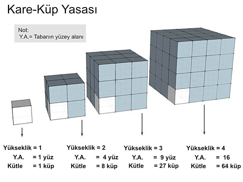 Eğer Godzilla yaşasaydı onu öldürmek için tanklara ve füzelere gerek duyulmayacaktı. Yerçekimi ve kare-küp yasası zaten bunu anında yapacaktı. Bir küp düşünün bir yüzünün alanı 6 cm2 olsun, böylece hacmi 1 cm3 olacaktır. Eğer bu kübün kenarını ikiye katlarsak, alanı 4 katına çıkar (6l26l^2); ancak hacim 8 katına çıkar (l3l^3). Matematiksel olarak bunu sonsuza kadar büyütmek mümkündür; ancak fiziksel gerçeklik içinde bir küp, hele ki hayatta kalmak için dışarıdan enerji alımına muhtaç bir küp, bir süre sonra kendi ağırlığı üzerine çökecektir. Çünkü enerji ve madde alışverişi hacimle değil, yüzey alanıyla yapılabilen bir süreçtir; buna rağmen, beslenmeye ihtiyaç duyan şey hacmin tamamıdır. Bu nedenle yüzey alanının büyümesi sayesinde artan fiziksel girdi, hacmin büyümesi nedeniyle artan fiziksel ihtiyacı karşılayamaz ve sistem çöker. Sırf bu nedenle biyolojik organizmalarda hücrelerin erişebileceği maksimum bir büyüklük vardır.