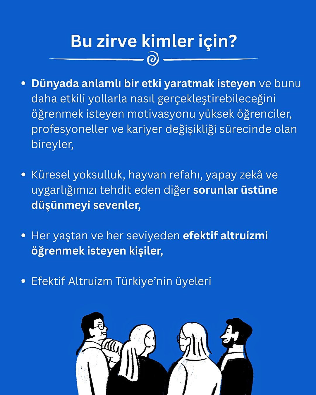 18 Ekim’de Maslak’ta gerçekleşecek olan Etkili İyilik İstanbul Zirvesi'nde dünyaya en fazla faydayı nasıl sağlayabileceğinizi ve etki yaratmak için somut olarak neler yapabileceğinizi keşfedecek ve sizinle aynı değerlere sahip insanlarla anlamlı bağlantılar kuracaksınız.