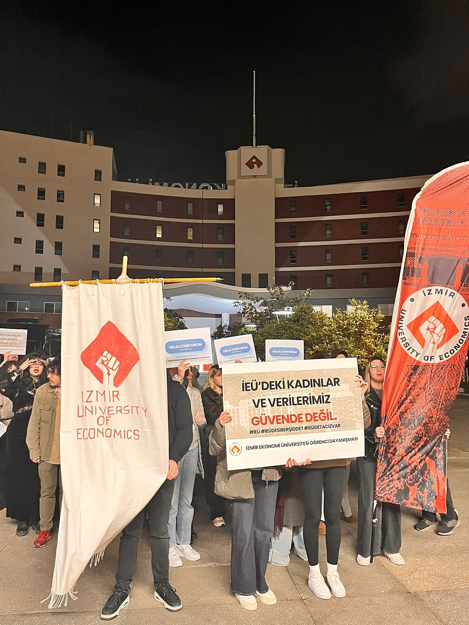 4 Ocak 2026 gününde İzmir Ekonomi Üniversitesindeki öğrencilerin bilgileri üzerinden, kadınların resikalık fotoğrafları üzerinden ahlak dışı bir şekilde sıralamak için açılmış site neticesinde, biz İEÜ öğrencileri olarak verimizin güvenli tutulamıyor olmasına öfkelendik. 5 Ocak Pazartesi günü ise bu durum üzerinden, kampüs içerisinde, öğlen 12.00 saatinde oturma eylemi ve akşam 19.45 saatinde ise kampüs içinde bir yürüyüş + basın açıklaması gerçekleştirdik.
