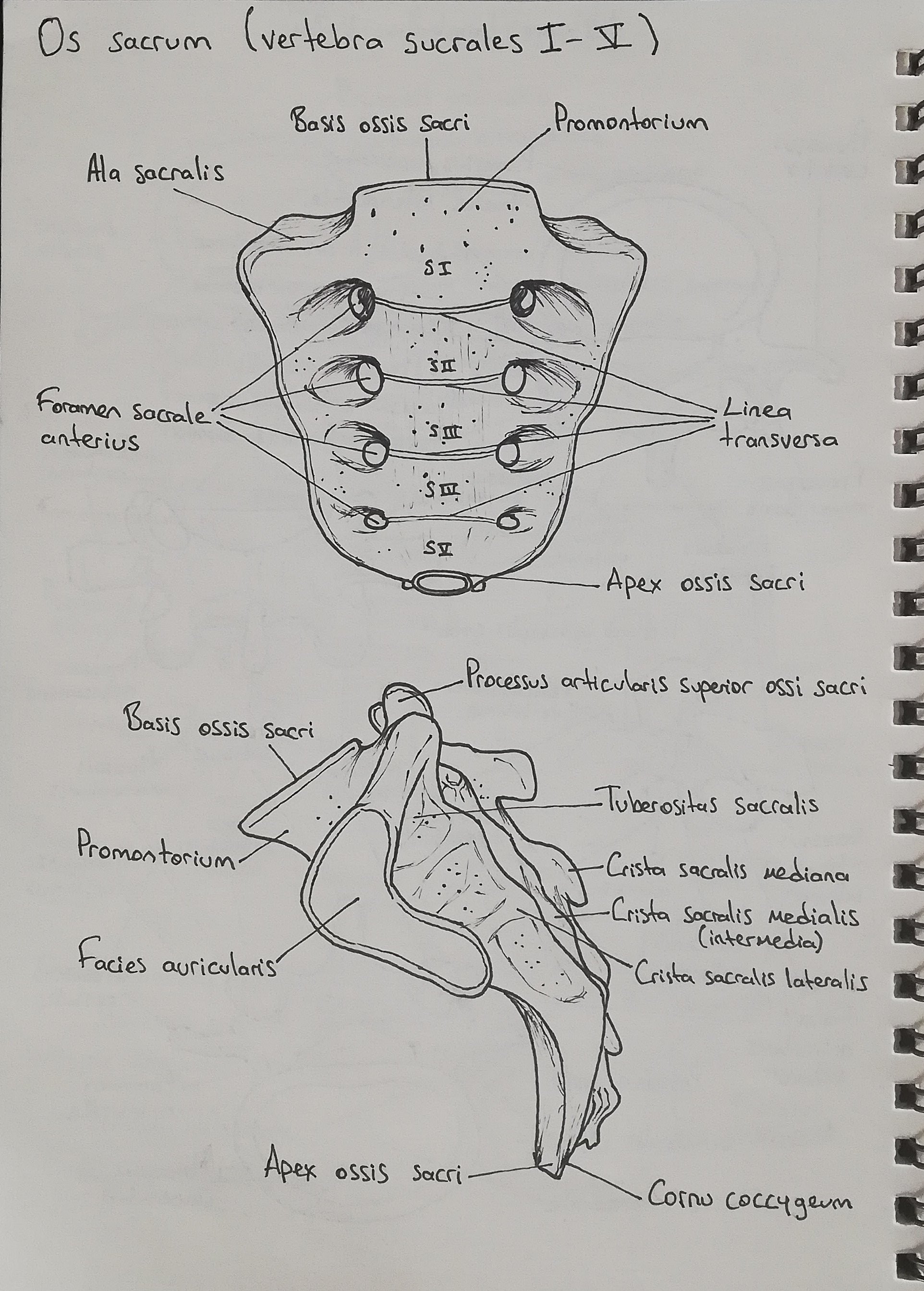 Ön yüzdeki 4 çift foramen'den sakral spinal sinirlerin ramus anterior'ları çıkar. Arka yüzde orta çizgide processus spinosus'ların kaynaşmasıyla crista sacralis mediana oluşur. Processus articularis superior ve inferior'ların kaynaşmasıyla crista sacralis intermedia ve proc. transversus'ların birleşmesi sonucu da crista sacralis lateralis oluşur.