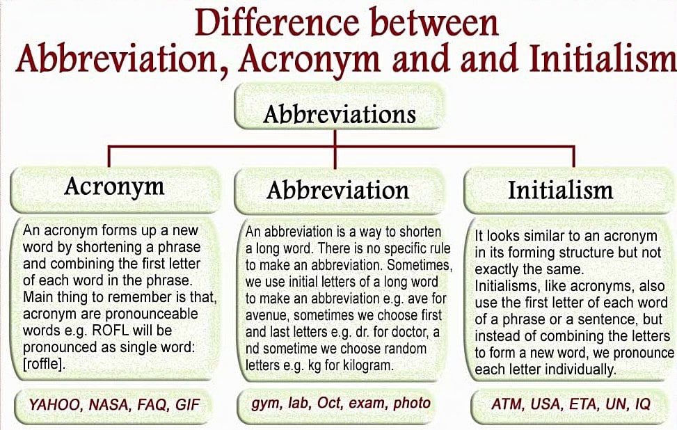 Akronim (Acronym): İki veya daha fazla sözcüğün baş harflerinden veya ilk birkaç harfinden oluşturulmuş kelime. Kelimenin artık harf harf değil bir bütün olarak okunduğu hal (örn. ASAP)