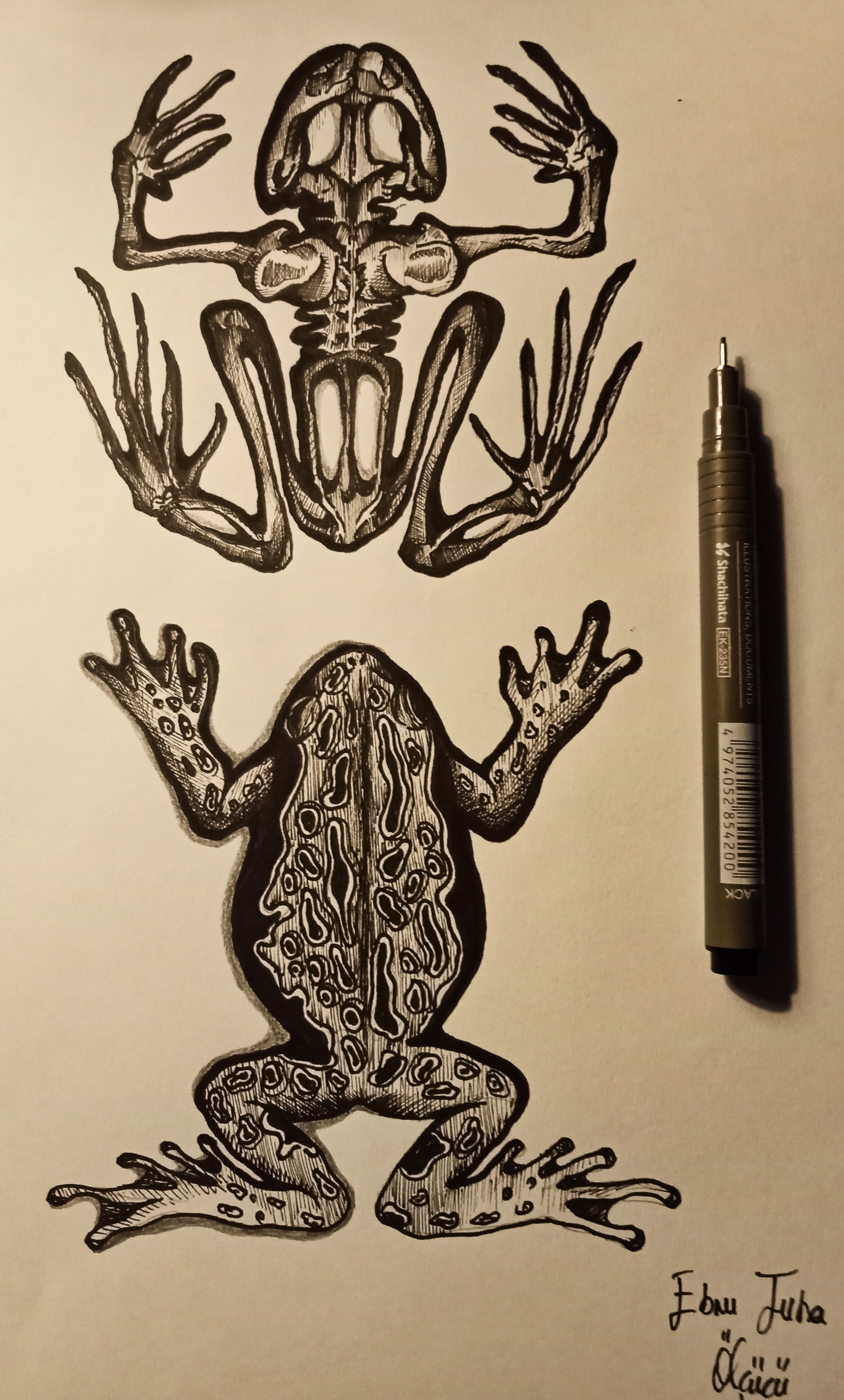 Amfibiler (amphibian), hem su hem de kara habitatlarında yaşama yetenekleriyle karakterize soğukkanlı canlılar olarak gezegenimizdeler. Kurbağalarda, bu muhteşem sınıf içerisindeki ilginç canlılardan biri. Çizmekten çok keyif aldığım bir çalışma oldu. A3 üzerine mürekkep.
