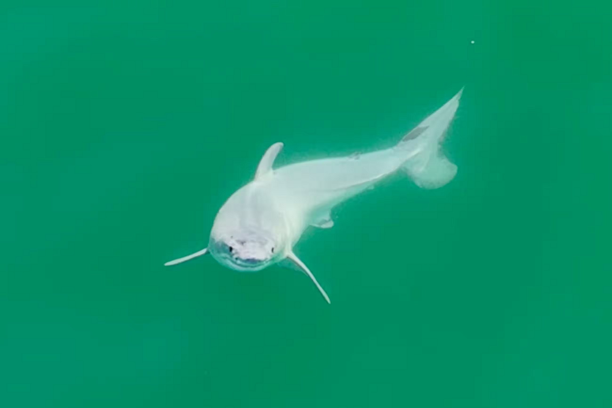 Kaliforniyalı araştırmacılar, geçen yaz drone ile çektikleri görüntülerde vahşi doğada daha önce hiç görülmemiş, yeni doğmuş bir beyaz köpekbalığını görüntülemiş olabilir. Yetişkin köpekbalıkları normalde gri renktedir. Araştırmacılar, beyaz rengin yavrunun embriyonik tabakasından kaynaklandığını düşünüyor.
