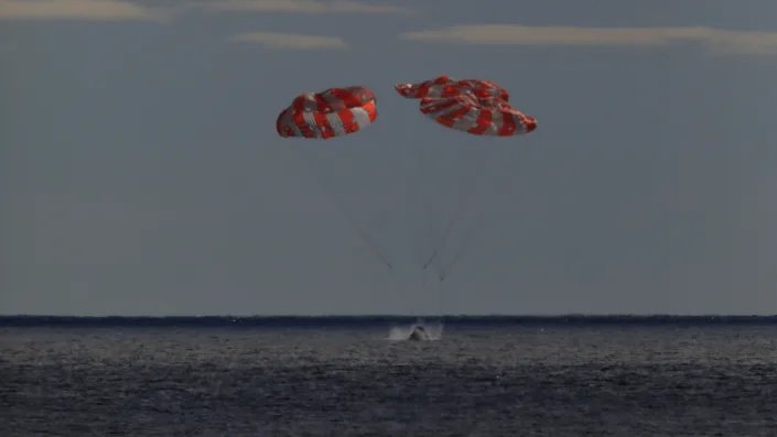 Uzay aracı, ay ile Dünya arasında 239.000 mil (385.000 kilometre) kat ettikten sonra Dünya atmosferinin kalın iç katmanına yaklaşarak yolculuğunun son bölümünü tamamladı. Meksika'nın Baja California açıklarında Pasifik Okyanusu'na Pazar günü 12:40 pm ET'de sıçradı. Kapsül daha sonra Pasifik Okyanusu'nda altı saat geçirdi ve NASA ek veriler topladı ve kurtarma ekibi onu hareket ettirmeden önce bazı testler yaptı.