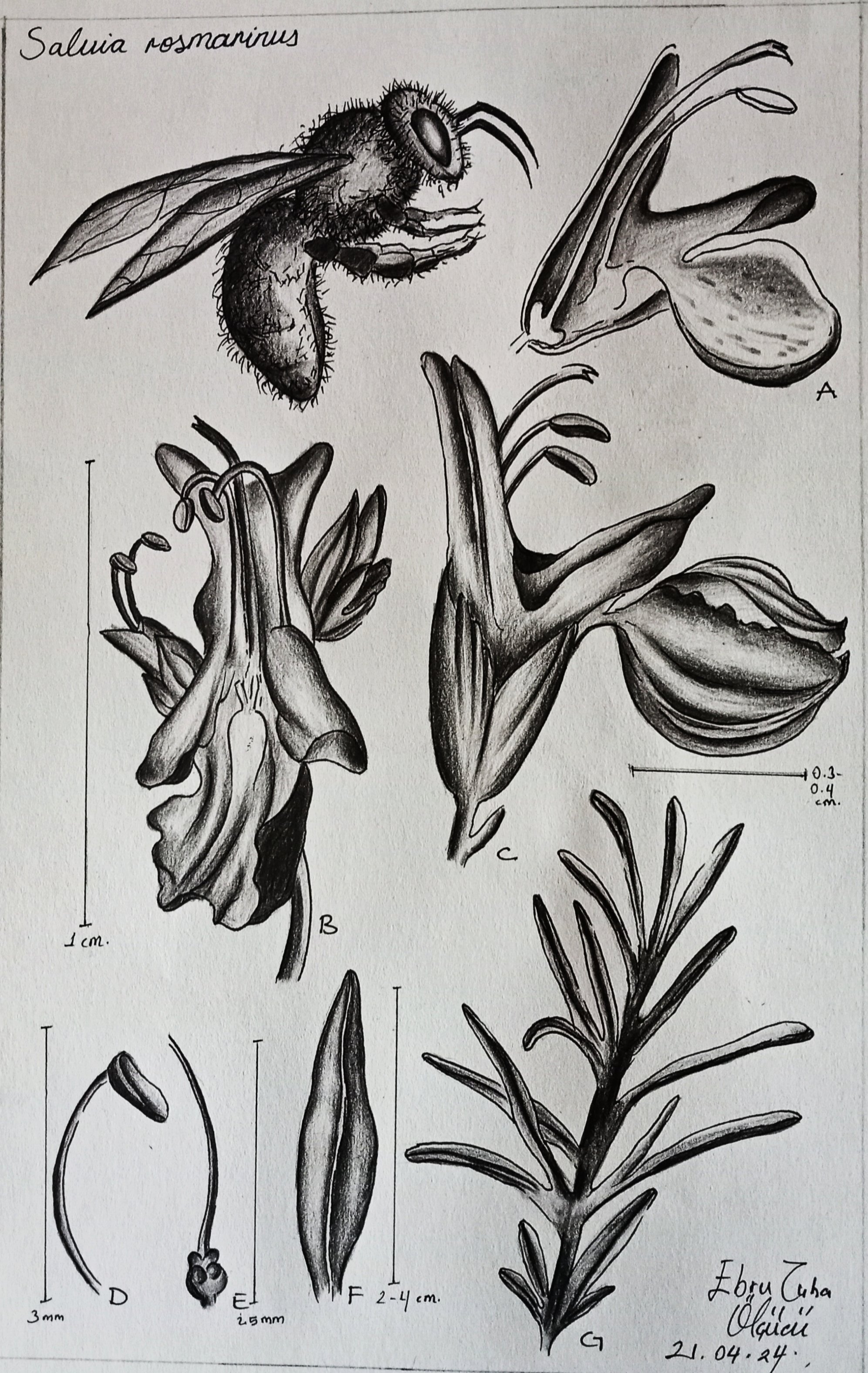 Biberiye bitkilerinin çiçek açma vakti geldi! Onları, çevresinde gezinen arılarla birlikte görebilirsiniz. Çizimimin harf karışıklıkları; A: çiçek kesitinin yandan görünümü B: çiçeğin önden görünümü C: çiçeğin yandan görünümü D: anther E: yumurtalık ve dişicik borusu F: yaprak G: dal üzerinde yapraklar
