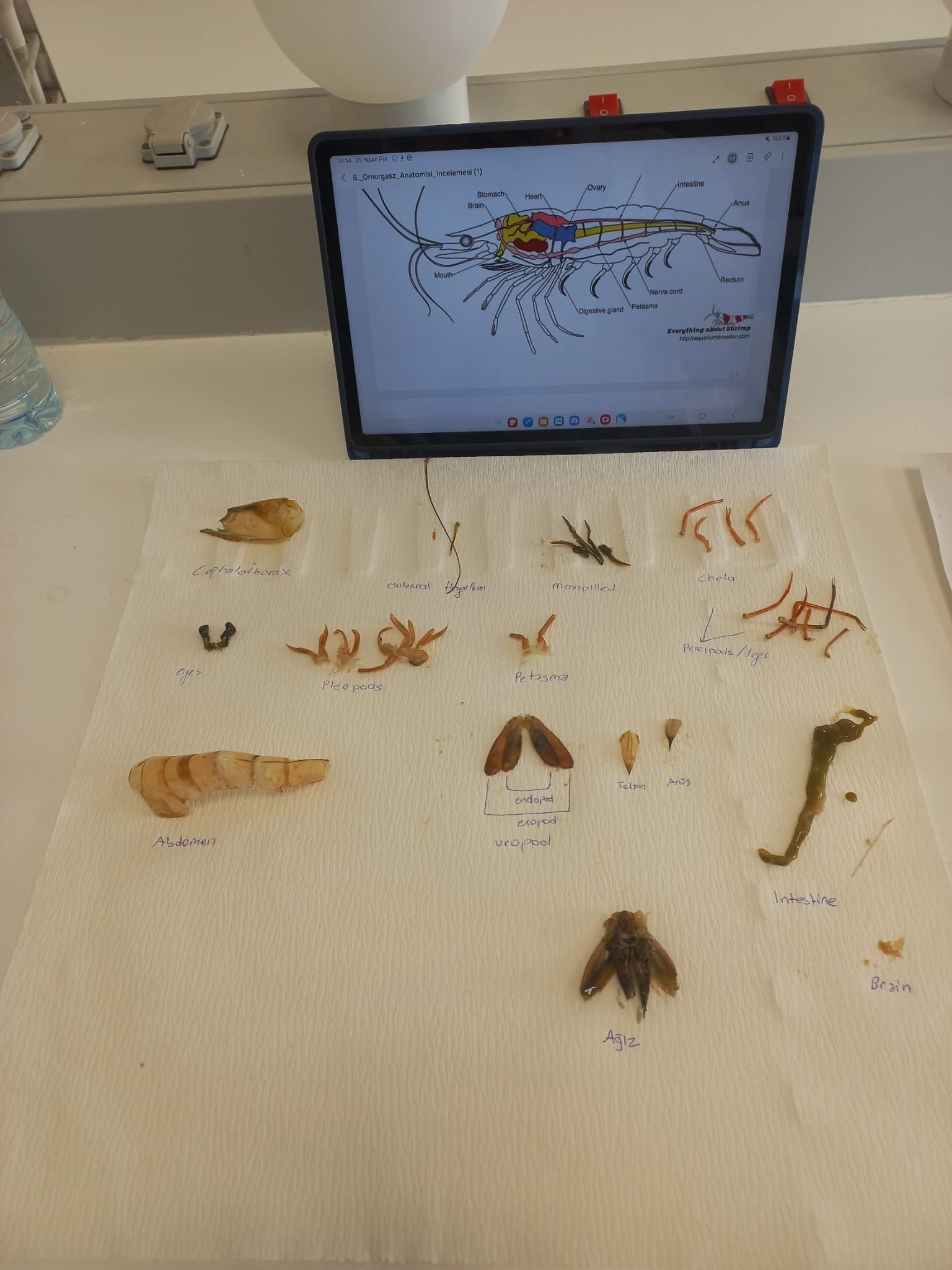 Bir lab dersinde yaptığımız karides anatomisi incelemesi. Beyin ve kalbi tam anlamı ile çıkaramadık ama onun dışında bir karidesin iç ve dış anatomisi.