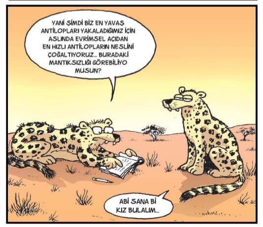 Bir soru değil de, espiri karışık bir sohbet konusu sadece. Karikatürde yazıldığı gibi hep en yavaş olanları yakaladıkları için geriye kalanlar daha hızlı olacak ve bu da yeni doğacak yavruların daha sağlıklı ve hızlı olması ihtimalini arttıracak. Tabii ki, evrim vahşi hayvanlarda da durup beklemiyor. Leoparların da daha hızlısının av yakalayıp hayatta kalma şansı daha yüksek olduğu için onlar da gittikçe hızlanıyor. Ama bu hızın de fiziksel bir sınırı vardır elbet.