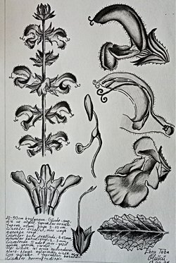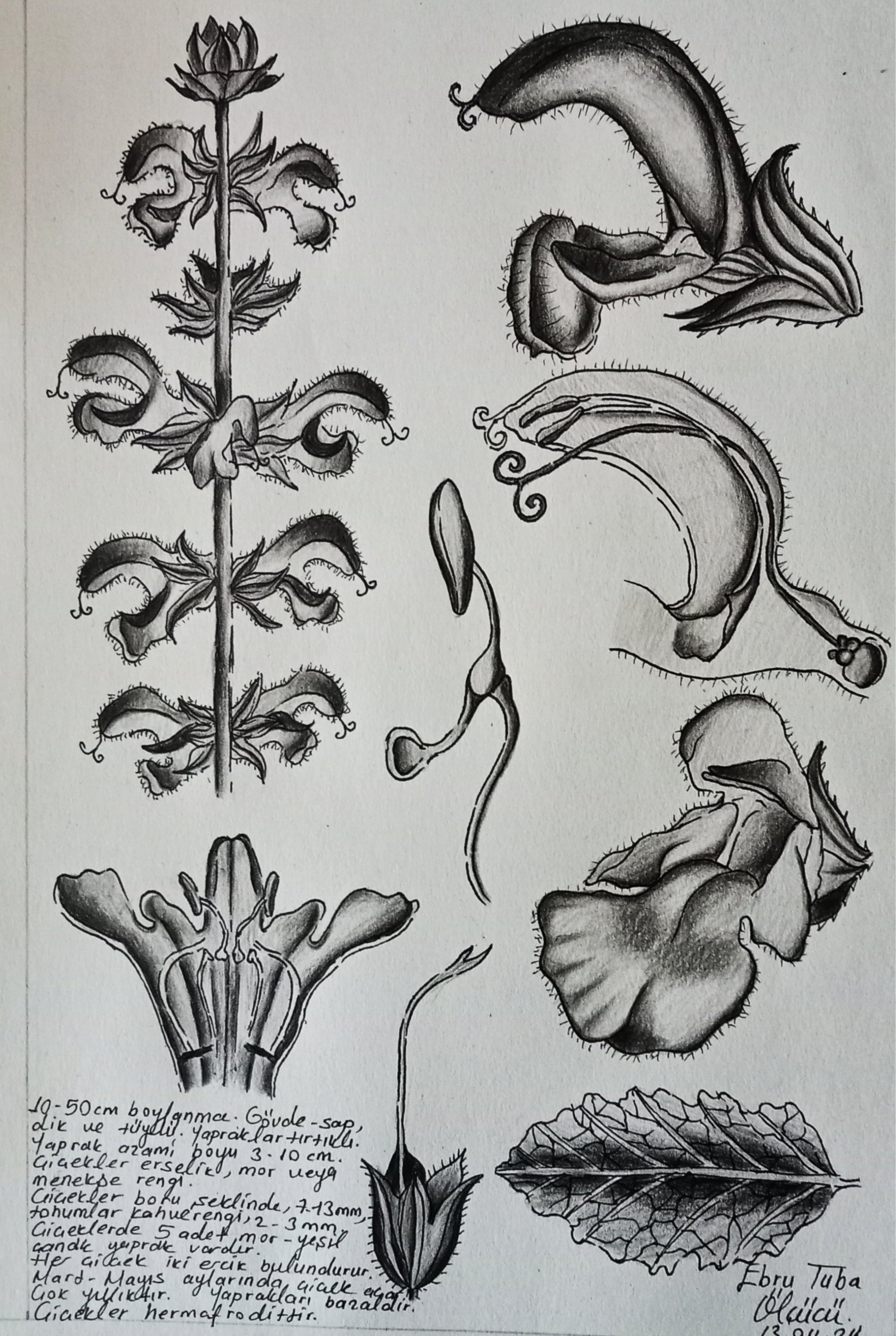 Birkaç gün önce tür ve gözleme eklediğim Salvia verbenaca (yabani adaçayı) bitkisinin çiçeklerinin morfolojisini çizme fırsatı buldum. Sol altta çiçeğin ortadan kesilmiş hali, sağ üst yandan duruşu ve altındaki onun kesiti. Onun altındaki ise çiçeğin çapraz - önden görünüşü.