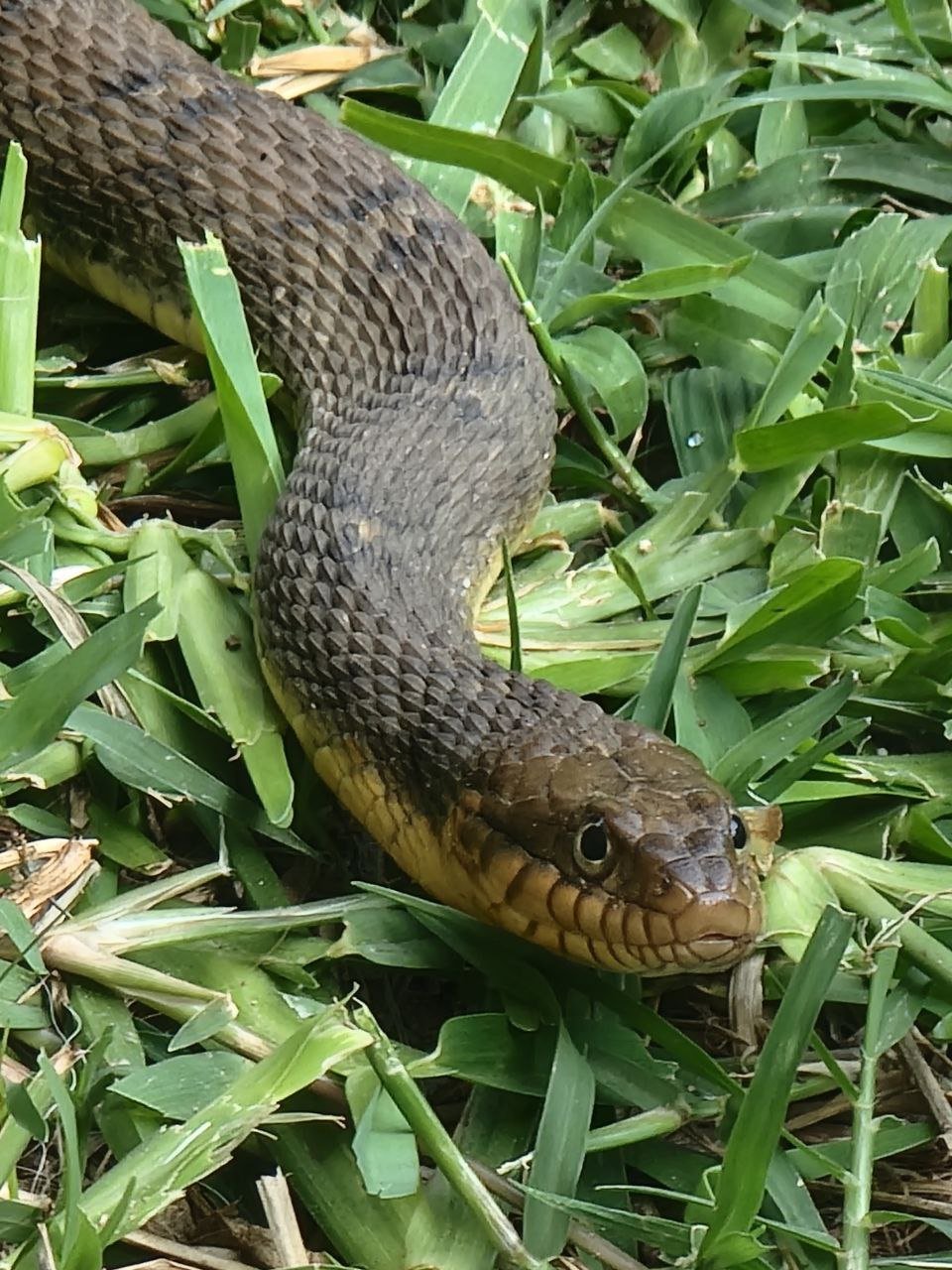 Bizim bahçeden bir güzellik: Düz-karınlı Suyılanı (Nerodia erythrogaster). Genelde bahçedeki kurbağaların peşinde olsa da bazen tavuk yumurtalarını, ağzına geçirebilirse de civcivleri hedef alabiliyor. Gerçi bu defa bizim köpeğe denk gelerek sert duvara tosladı ve kuyruğunu kıstırıp kaçmak zorunda kaldı ama bir gün tekrar uğrayacağına şüphem yok.