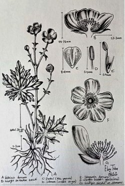 Bu bir Ranunculus acris, Türkçe adıyla Acı düğünçiçeği. Cins adı (Ranunculus) Latince ''küçük kurbağa'' anlamına gelir. Bu da, cinsin bazı türlerinin sulak alanlara yakın ve yapraklarının kurbağa ayağına benzemesine atıftır. Bitkinin antikçağdaki diğer adı Batrachion'dur ve bu da ''kurbağa otu'' anlamına gelir. Bu cinsin ilk Türkçe adı ''döğün'' çiçeğidir. Döğün, Türkçede yakmak/yakan anlamına gelir ve cinse bağlı bazı türlerin temas halinde cildi tahriş etmesine işaret eder. Döğün kelimesi, yıllar geçtikçe düğün kelimesine dönüşmüştür.