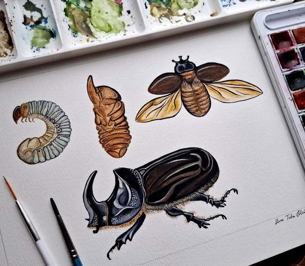 Bu çizimim, Oryctes nasicornis'in Türkçe adıyla Gergedan böceğinin yaşam döngüsünü gösteriyor. Larva evresi 2 yıla kadar sürebilir, bu süreçte organik maddeyi parçalayarak ekosisteme katkı sağlar. Pupa döneminde vücudu tamamen yeniden yapılanır ve gergedan boynuzuna benzeyen müthiş yapısıyla karşımıza çıkar.