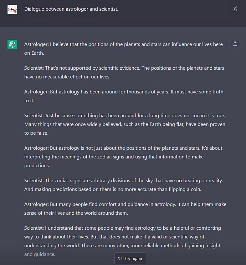 Bu OpenAI ChatGPT yapay zekası ile oluşturulmuş bir diyalog. Sahtebilimci ile bilim insanı arasında geçen bir diyalog oluşturmasını istedim ve sonuç gerçekten etkileyici. Bu diyaloğun yapay zeka tarafından oluşturulduğunu anlamak için yapay zeka tarafından oluşturulduğunu bilmek gerek. Yapay zekanın bunları yapabileceğini biliyorduk ama bu kadar hızlı olacağını tahmin edemezdik.