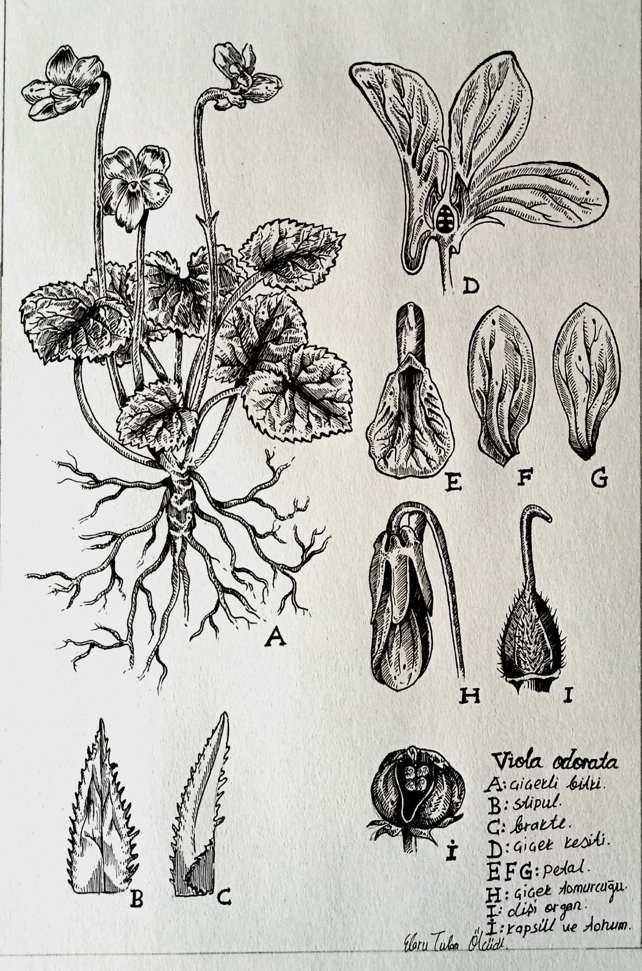 Bugün çizimime konuk olan bitki, dilimizde kokulu menekşe olarak bilinen Viola odorata. Bitki stolonları sayesinde yayılır. Çiçekler erseliktir, nisan ve mayıs aylarında açar, çoğunlukla mor renkli olup çiçeklerin başı eğiktir. Bitkinin çiçekleriyle birlikte Anadolu'da çeşitli hastalıklara karşı kullanıldığı bilinmektedir. Hemen hemen her bölgede gözlemlenebilir. Bitkinin yanındaki harflerin karşılığını sağ alttan okuyabilirsiniz.