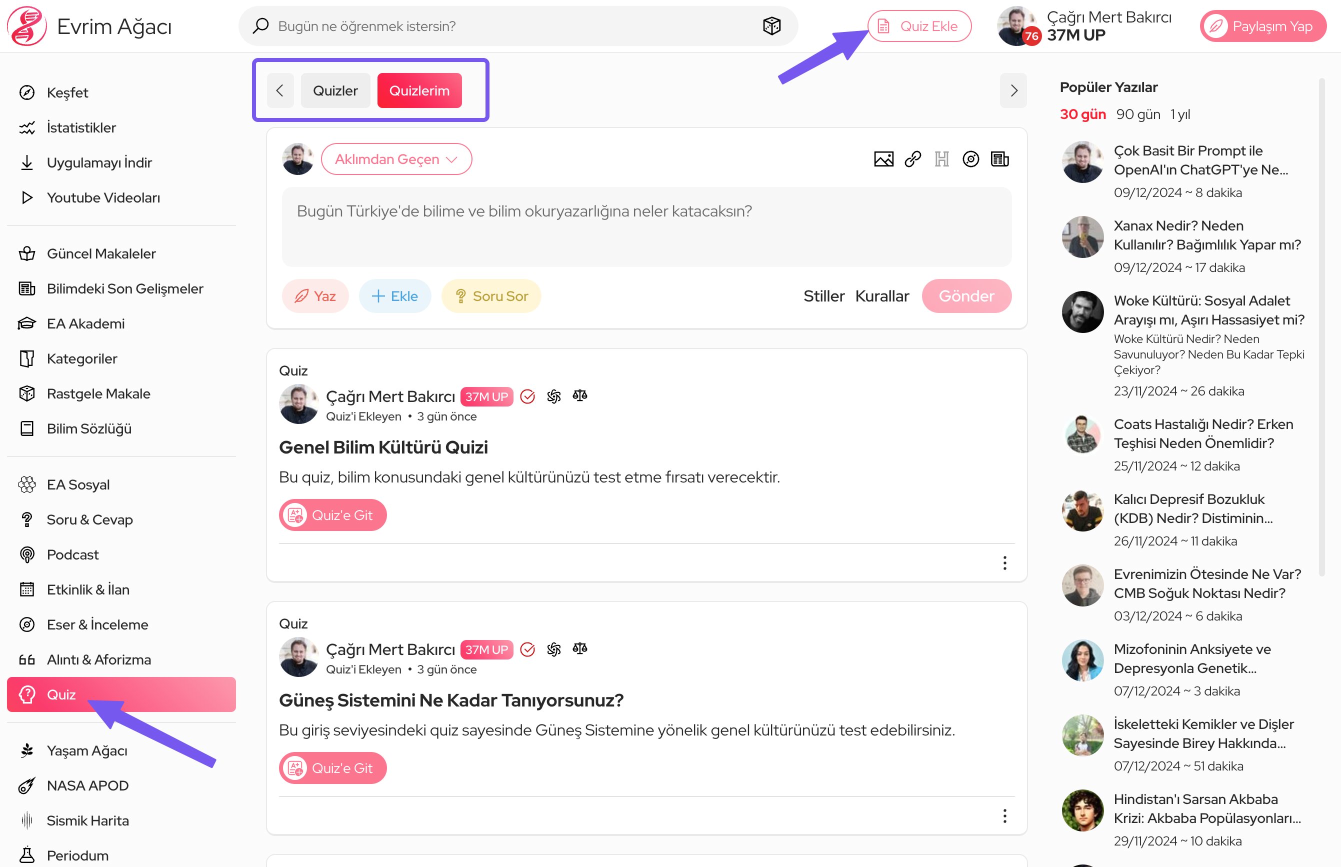 Bugün, kutlu bir gün arkadaşlar! Bugün, Evrim Ağacı Quiz'i ilan ediyoruz! Bir örnek olarak bu quizi hemen deneyebilirsiniz: https://evrimagaci.org/quiz/turkiyede-evrim-ve-bilim-ne-kadar-dogru-biliniyor-8