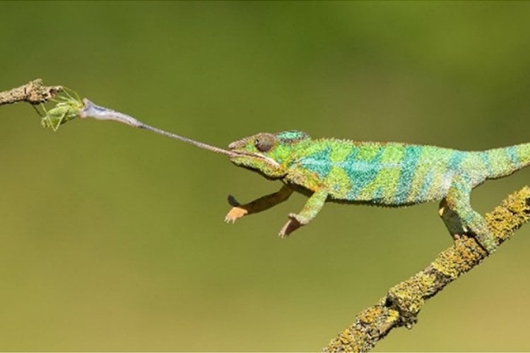 Bukalemunlar dillerini o kadar hızlı atıyormuş ki bir jetle kıyaslanırsa bukalemun dili 5 kat daha hızlıymış Dilleri yapışkan olduğu için avları kaçamıyor. Kamufle olduğunda uzaktan avını yakalayabiliyor , bunu uzun diline borçlu.
