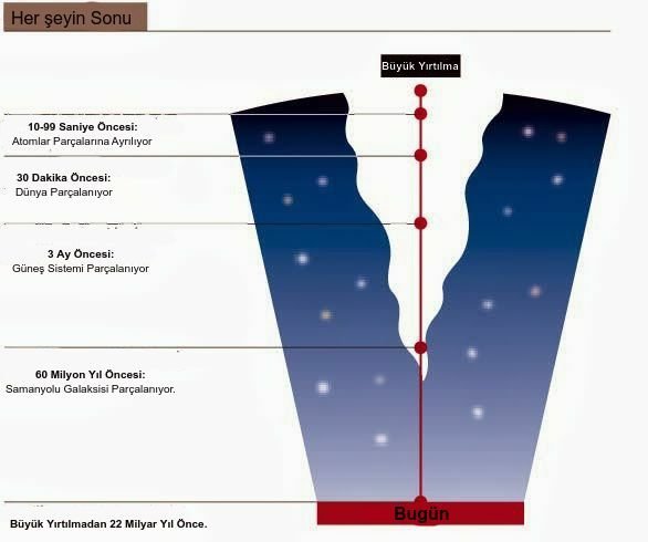 Büyük Yırtılma: Evrenin ivmelenerek genişlediği tezini kabul eder. Böylece karanlık enerji evreni yırtmaya başlar. Galaksi sistemleri, galaksiler, yıldız kümeleri, gezegen sistemleri, gezegenler, atomlar ve uzay zaman dokusu parçalanır. Geriye hiçbir şey kalmaz. Fakat genelde kabul gören teori büyük soğuma. Büyük Soğuma: Evren genişler fakat ivmelenerek değil. Sabit bir hızla. Sonda ise büyük bir boşluk kalır.