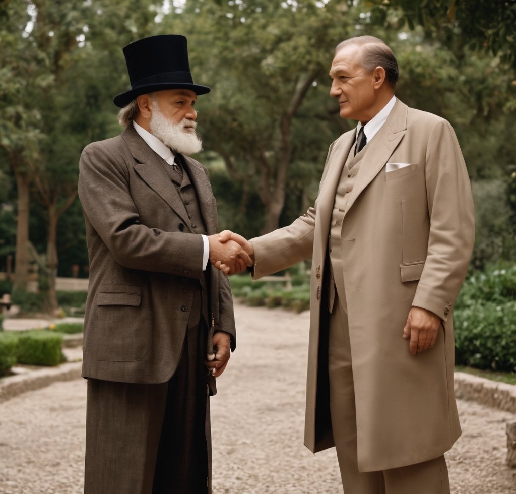 Prompt: Charles Darwin and Kemal Ataturk handshaking