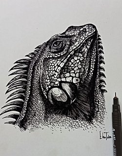 Çizerken ayrıntılarıyla beni tekrar kendine hayran bırakan iguanaların ayırt edici özellikleri arasında, boğazın altındaki sarkık bir gerdan, boynun ortasından kuyruk tabanına kadar uzanan dermal dikenlerden oluşan bir sırt tepesi ve uzun, sivrilen bir kuyruk yer alır. Kafadaki pullar vücudun geri kalanındaki pullardan daha büyük ve daha düzensizdir. Yanal konumdaki gözler hareketsiz bir göz kapağı ve serbestçe hareket edebilen alt göz kapağı tarafından korunur.