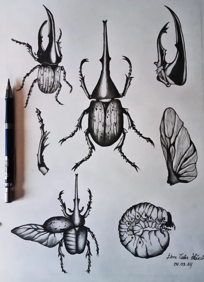 Çizerken hem hayranlık hem de şaşkınlık duyduğum "Hercules beetle" (Herkül böceği) morfoloji çizimim.