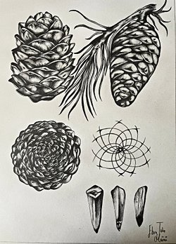 Çizimime konuk olan kozalaklar, iğne yapraklı ağaçların tohumlarını koruyan yapılardır. Genellikle erkek ve dişi çam kozalakları aynı ağaçta oluşur. Bir çam kozalağı hayal ettiğinizde muhtemelen odunsu, sarmal pullara sahip dişi bir kozalak hayal ediyorsunuzdur. Bunun nedeni, erkek çam kozalaklarının çok daha küçük, süngerimsi ve yumuşak olmasıdır. Dişi kozalaklar uzun ömürlü, erkekler ise yalnızca ilkbaharda karşımıza çıkacak kadar kısa ömürlüdür.
