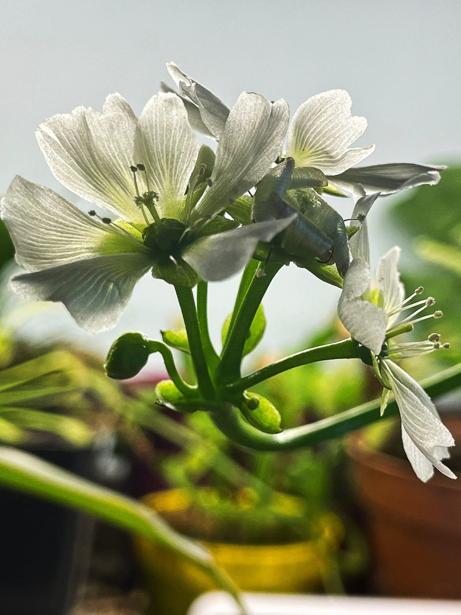 Daha önce hiç sinekkapan bitkisinin çiçeğini gördünüz mü? Bu çiçekler etobur bitki olan Dionaea muscipula, Türkçe ismiyle Venüs sinekkapanı'na ait. Onları daha çok ağıza benzer kapanları ile böcekleri ''avlayan'' bir bitki olarak tanıyoruz. Ancak bence onun bu güzel çiçeklerini de tanımaya fırsat vermeliyiz. Doğal yaşam ortamını taklit etmeye çalıştığımda çiçeklerle karşılaşınca başarı elde ettiğimi anladım. Taç yapraklar beyaz, damarlı ve çiçekler erseliktir. Ev ortamlarında bakılan bu bitkinin uygun koşullar sağlandığında çiçek açtığına şahit olmak çok keyifliydi!