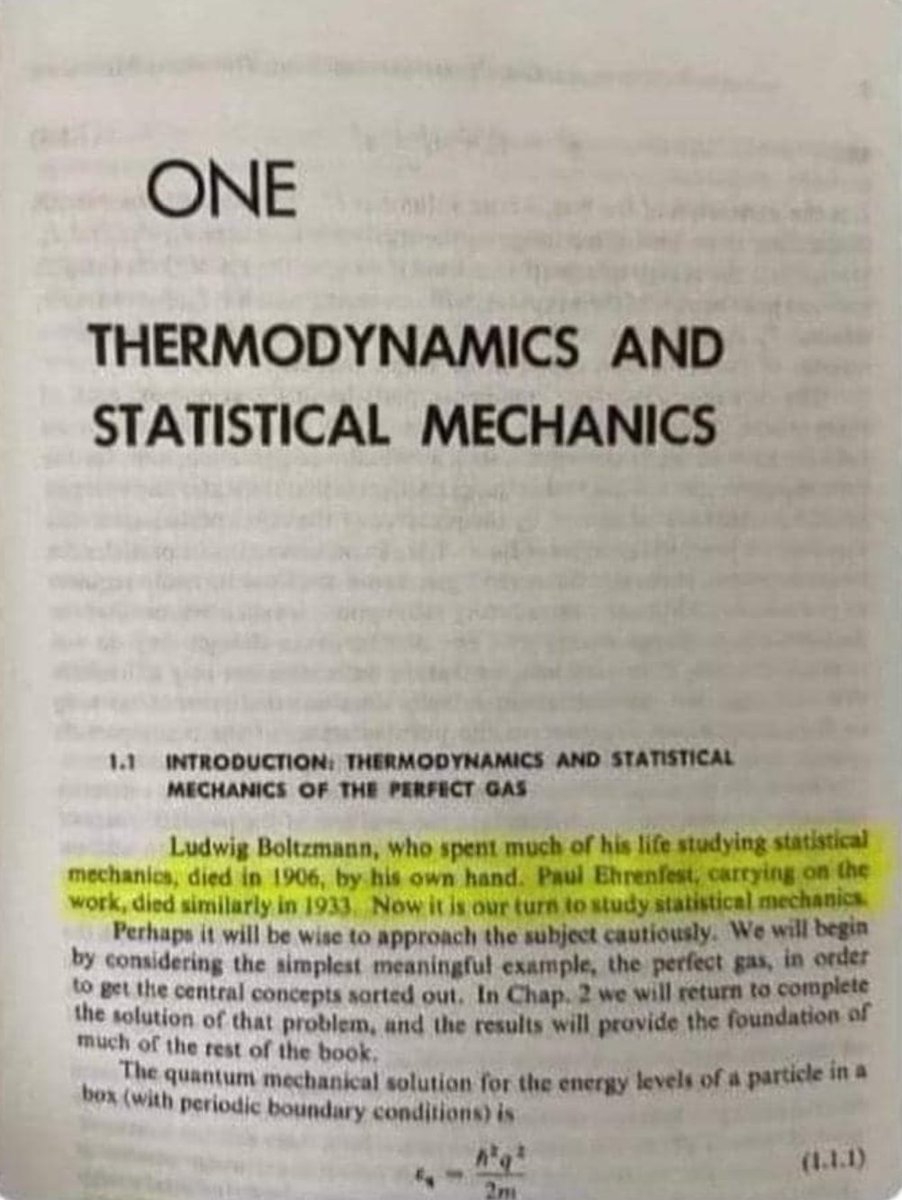 "Hayatının büyük bir kısmını istatistiki mekanik araştırmalarına ayıran Ludwig Boltzmann, 1906 yılında intihar etti. Onun çalışmalarını sürdüren Paul Ehrenfest, 1933'te benzer şekilde öldü. Şimdi, istatistiki mekaniği araştırma sırası bizlerde."