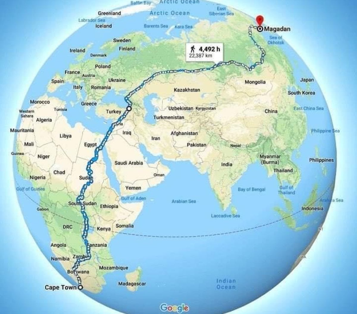 Dünya üzerinde kesintisiz olarak yürüyebileceğiniz en uzun rota. Güney Afrika'daki Cape Town'dan Rusya'nın doğu kıyısındaki Magadan'a kadar yürünebilecek bu 22,387 kilometrelik yolu henüz yürüyebilen kimse olmadı. Bu güzergâh boyunca hiçbir uçuş, feribot ya da tekneye ihtiyaç duyulmuyor; çünkü rota, sadece yollar ve köprülerden oluşuyor.