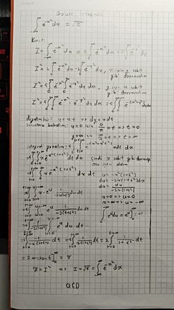 Euler-Poisson integrali olarak da bilinen Gauss integralinin ispatı. Gauss fonksiyonu f(x)=e^(-x^2)'in tüm reel doğru üzerindeki integralidir. Alman matematikçi Carl Friedrich Gauss'un adıyla anılan integral integral_(-∞)^∞ e^(-x^2) dx = sqrt(π) şeklinde gösterilir. Abraham de Moivre bu tür integrali ilk olarak 1733 yılında keşfetmiş, Gauss ise kesin integrali 1809 yılında yayınlamıştır. İntegralin geniş bir uygulama alanı vardır. Örnek olarak değişkenlerde küçük bir değişiklikle normal dağılımın normalleştirme sabitini hesaplamak için ve yol integrali formülasyonunda, harmonik osilatörün propagatörünü bulmak için kullanılır.