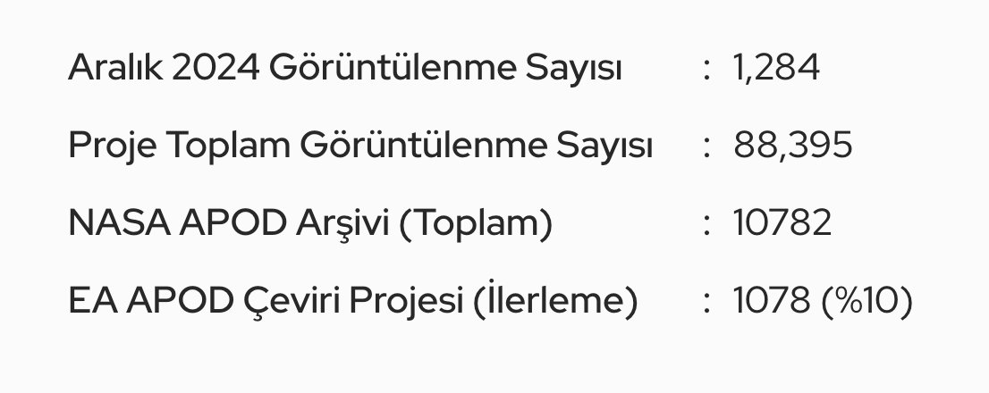 Evrim Ağacı olarak NASA'nın 1990'lardan beri "Günün Astronomi Fotoğrafı" (APOD) adıyla yayınladığı ve NASA bünyesinde en çok ilgi gören projesinde yayınlanmış 11.000'e yakın fotoğrafın %10'unu an itibariyle Türkçeye kazandırmış bulunmaktayız!