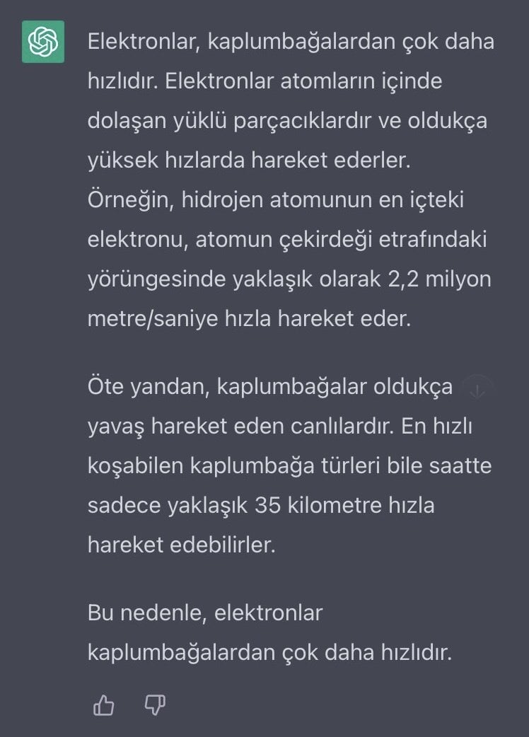 “Evrim Ağacı”nın elektronlarla ilgili bir makalesinde elektronların bir kaplumbağadan daha yavaş olduğu yazısı dikkatimi çekti. Bu konuyu “Chat-GPT”e sordum. Amma verdiği cevap tamamen farklı. Chat-GPT’e bu konuyu sorduğumda verdiği cevap şu: