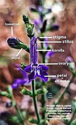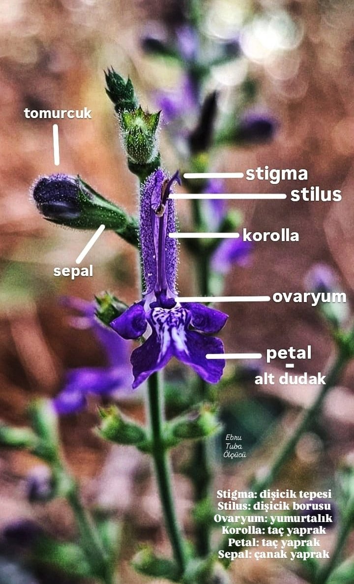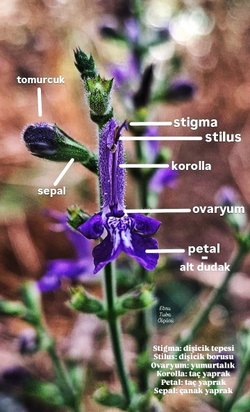 Salvia forskaehlei (Tr: Dolmayaprağı) bitkisinin göz alıcı çiçeği! Fotoğrafta işaretlediğim çiçek bölümleriyle bitkiyi daha yakından tanıyabilirsiniz. Bitki erselik (dişi ve erkek organları aynı çiçekte barındırma) olup, fotoğrafta erkek organlar gözükmemektedir. Çiçek sapı 2 ila 5 mm, petal yumurtamsı çan biçiminde ve 10 mm uzunluğundadır. Taç menekşe-mavi renkli, orta bölümü beyaz ya da sarı lekelidir. Bazı kaynaklarda Salvia forsskaolei, Salvia forskohlei, Salvia forsskaolii ya da Salvia forskaohlei olarak karşınıza çıkabilir.